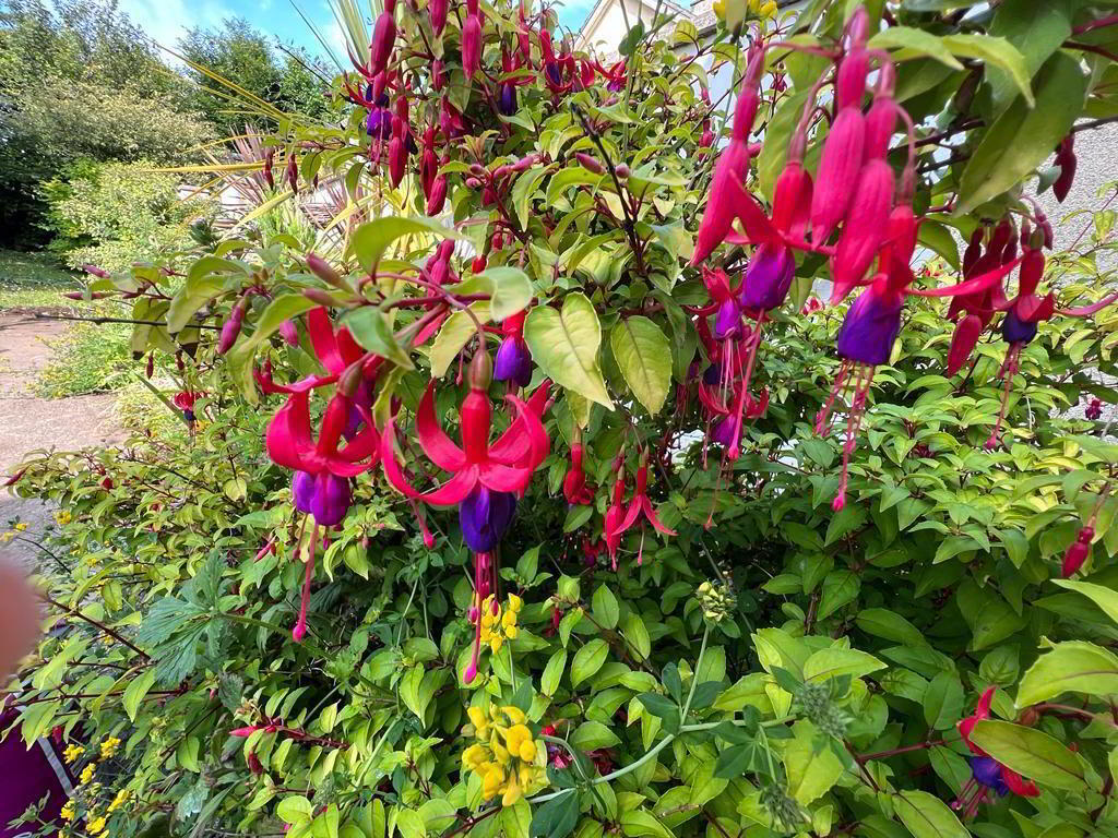 Walled to front. Lawn to rear with mature plants, trees & shrubs and pond. Paved patio area to rear.