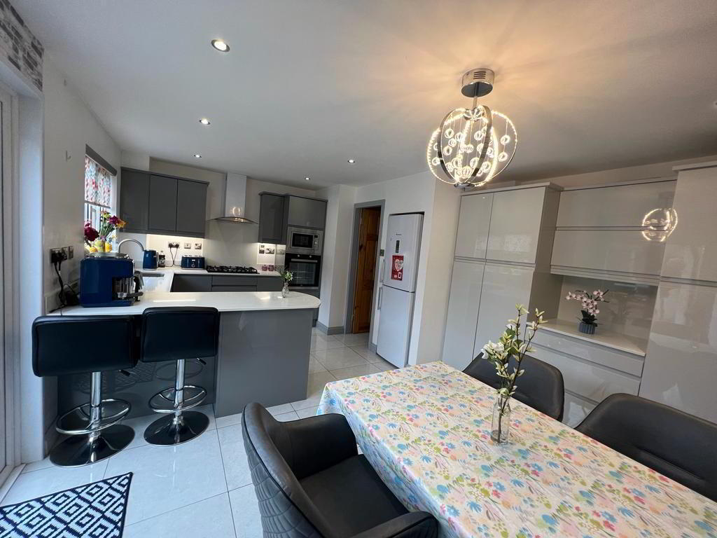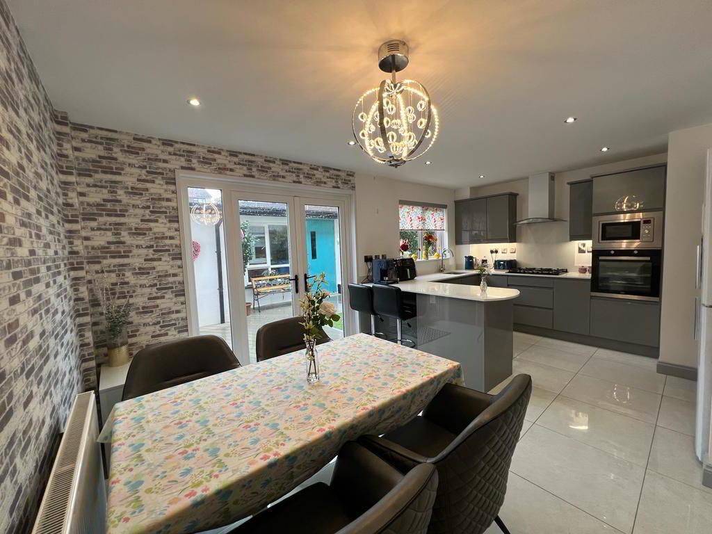 Having excellent range eye and low level units, stainless steel sink with mixer taps set into Quartz worktop, gas hob, integrated oven, stainless steel extractor hood, space for fridge / freezer, integrated dishwasher, breakfast bar, recessed lighting, tiled floor, ample dining space with French doors leading to rear.