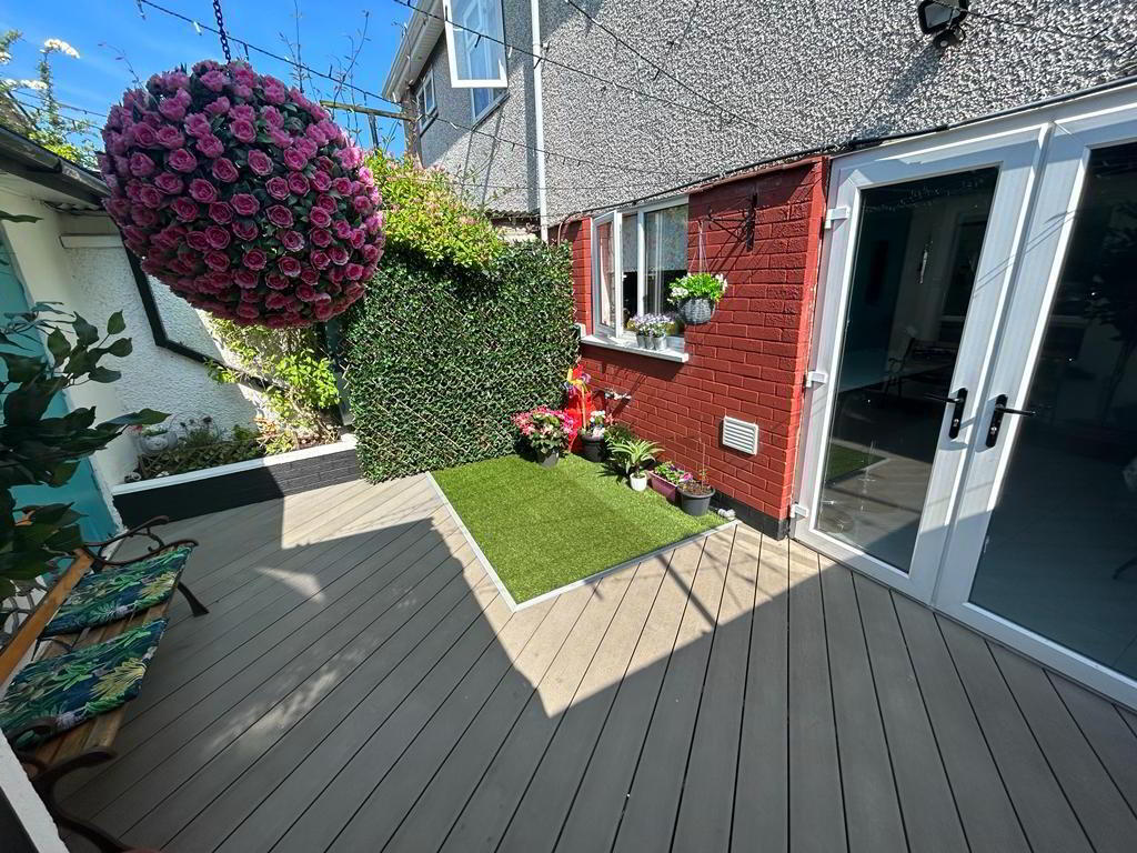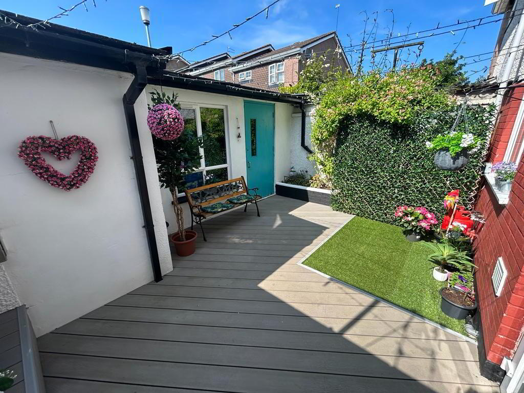 Garden to front bordered by hedge and enclosed by gate. Decking to rear leading to artificial lawn. Outside light and tap. Shed with light and power points.