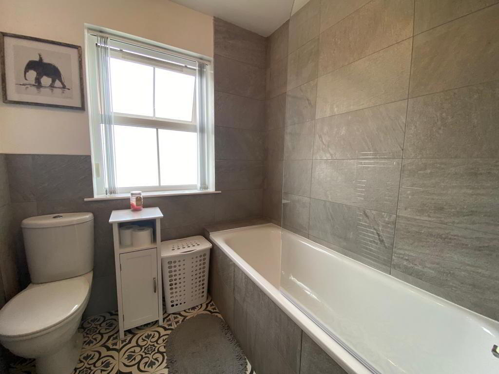 Comprising bath with shower over and tiling around, shower screen, whb and wc, remaining walls 1/2 tiled, tiled floor.
