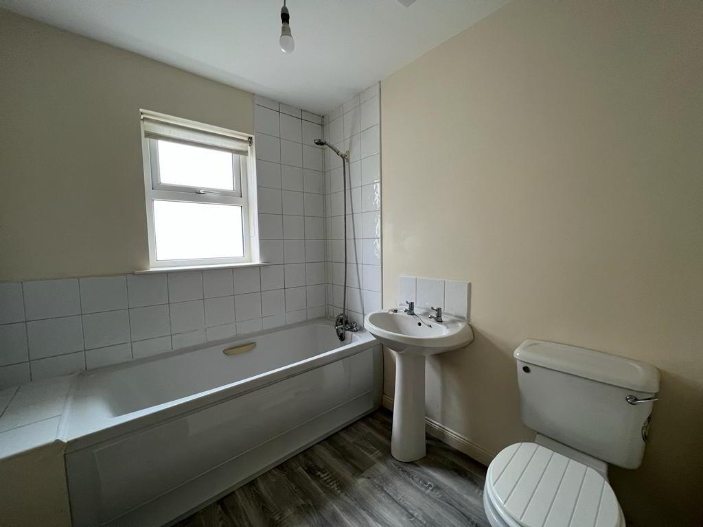 Comprising bath with shower fitting to taps and part tiling around, whb and wc.