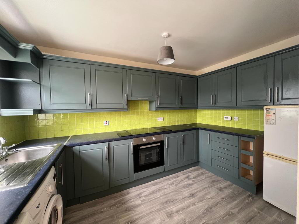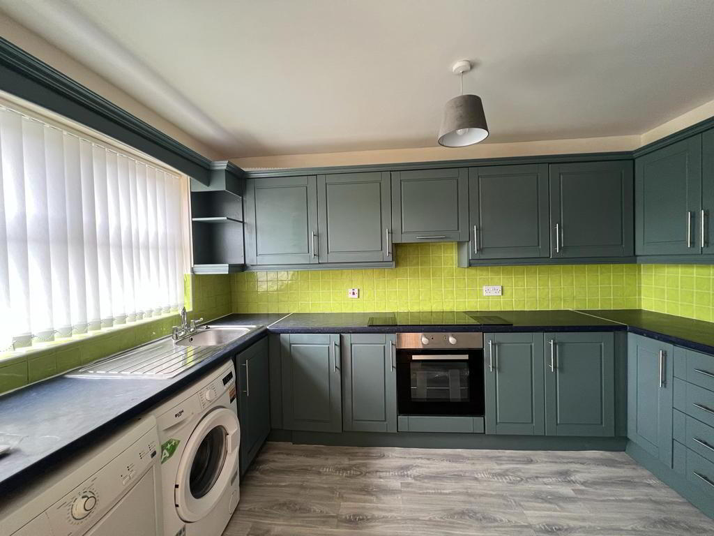 Having eye and low level units, tiling between units, single drainer stainless steel sink unit with mixer taps, hob, underoven, extractor hood, plumbed for washing machine, space for tumble dryer, space for fridge / freezer.