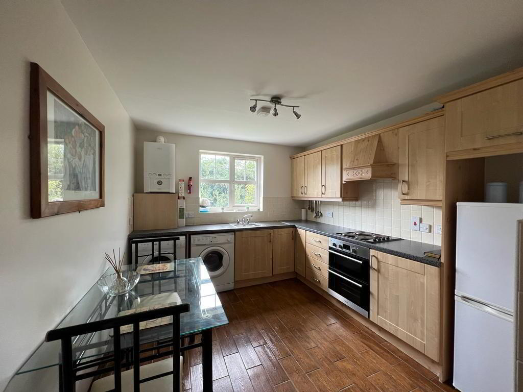 Having eye and low level units, tiling between units, single drainer stainless steel sink unit with mixer taps, hob, underoven, extractor hood, space for fridge / freezer, plumbed for washing machine, space for tumble dryer, dining space, tiled floor.