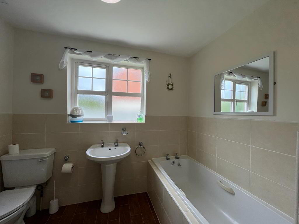 Comprising bath, walk in tiled electric shower, whb and wc, 1/2 tiled walls, tiled floor.