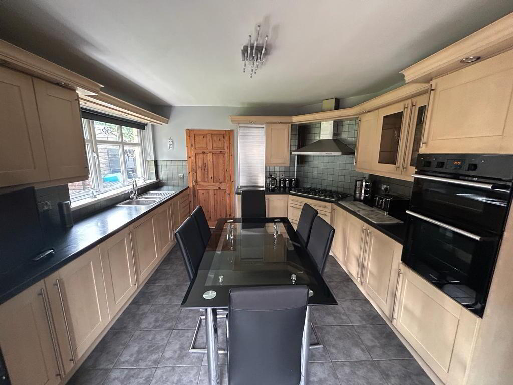 Having range of eye and low level units with under lighting, matching pelmet over window with lighting, tiling between units, 1 1/2 bowl stainless steel sink unit with mixer taps, glazed display unit, wine rack, gas hob, double oven, stainless steel extractor hood, space for American style fridge / freezer, integrated dishwasher, French doors leading to rear, tiled floor.