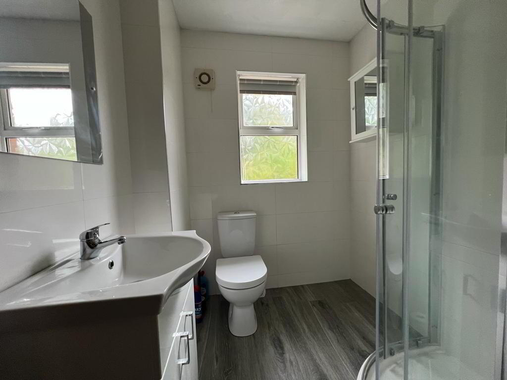 Comprising shower cubicle with PVC cladding, whb set in vanity unit, wc, tiled walls.