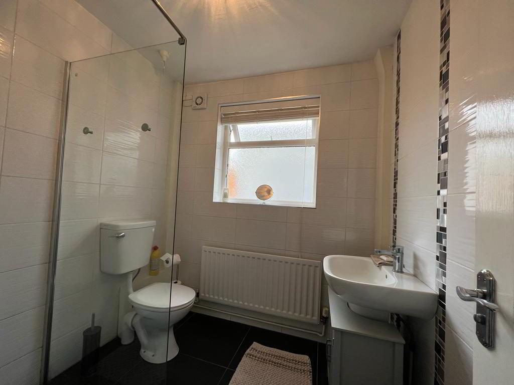 Comprising electric shower, whb and wc, fully tiled walls and floor.
