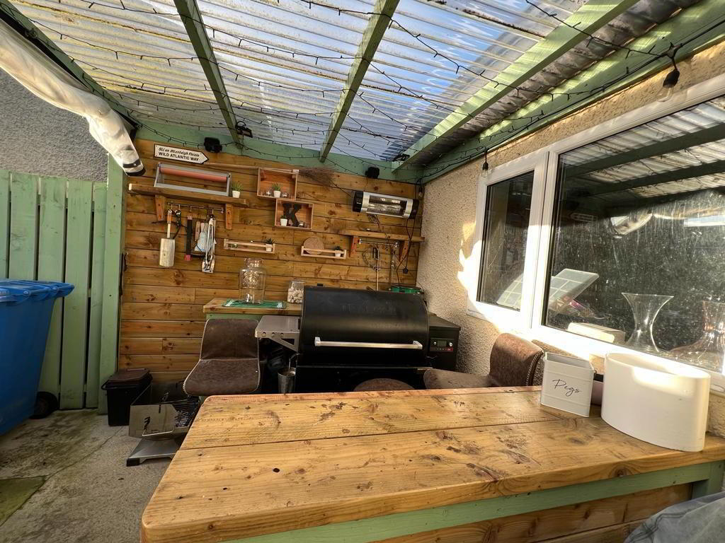 Enclosed to rear by gate. Covered barbecue area and bar. Tarmac driveway. Neat lawn to front.