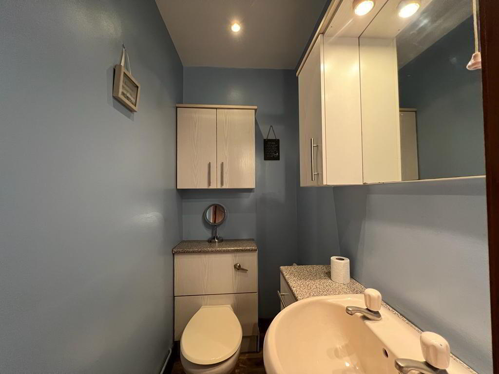Having built in wardrobes with sliding mirrored doors, laminated wooden floor. Toilet and whb off with recessed lighting.