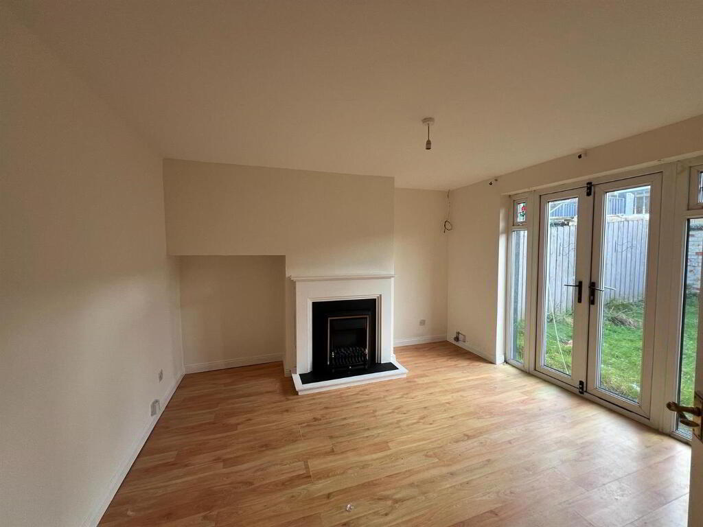 Having fireplace with electric inset, laminated wooden floor, French doors leading to lawn.