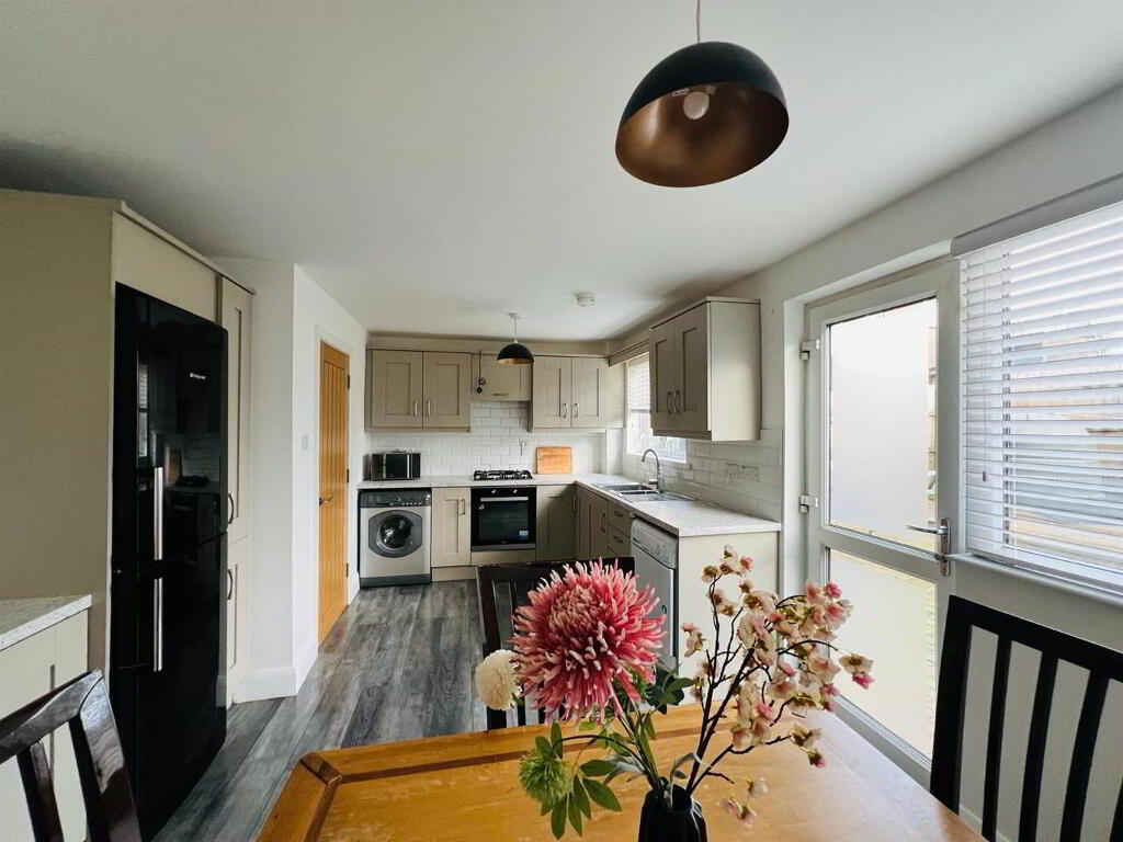 Having range of eye and low level units, tiling between units, 1 1/2 bowl stainless steel sink unit with mixer taps, gas hob, electric underoven, Hotpoint washing machine and tumble dryer, Hotpoint fridge / freezer, ample dining space, laminated wooden floor.