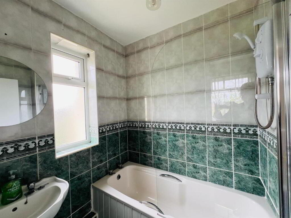 Comprising bath with electric shower over, whb, fully tiled walls and floor.