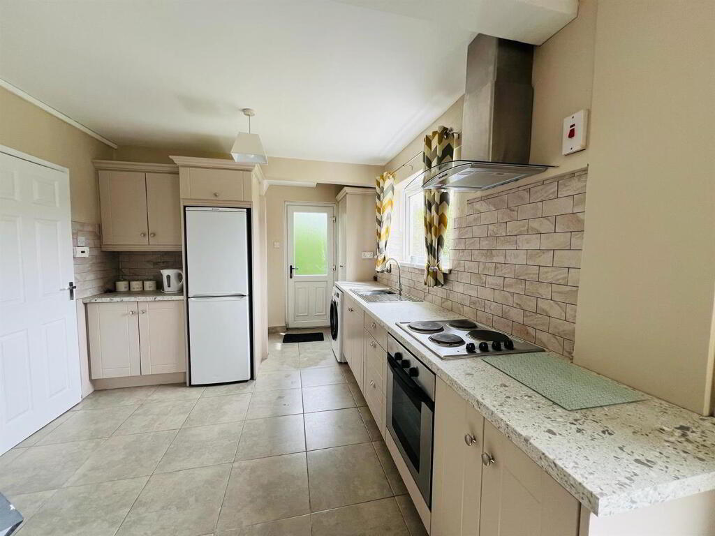 Having range of eye and low level units, tiling between units, single drainer stainless steel sink unit with mixer taps, hob, underoven, stainless steel extractor hood, plumbed for washing machine, space for fridge / freezer, ample dining space, tiled floor.