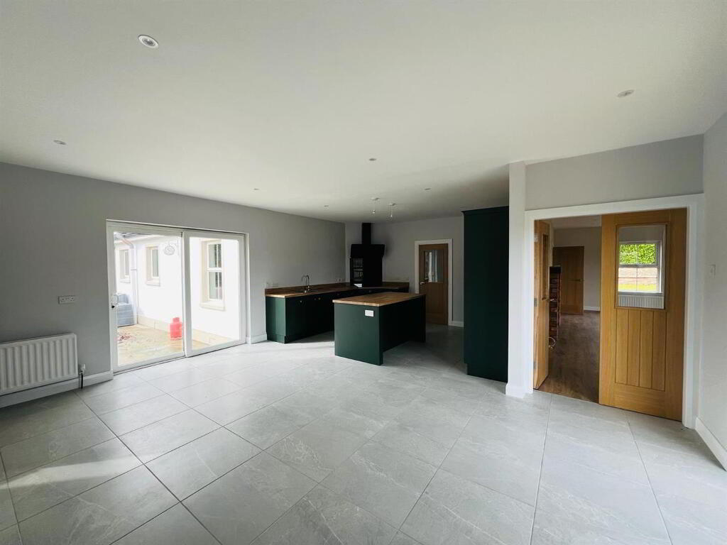 Having range of eye and low level units, single drainer stainless steel sink unit with mixer taps, centre island, hob, oven, extractor hood, space for American style fridge / freezer, integrated dishwasher, ample dining space, tiled floor, French doors leading to decked patio area, sliding patio doors to side.