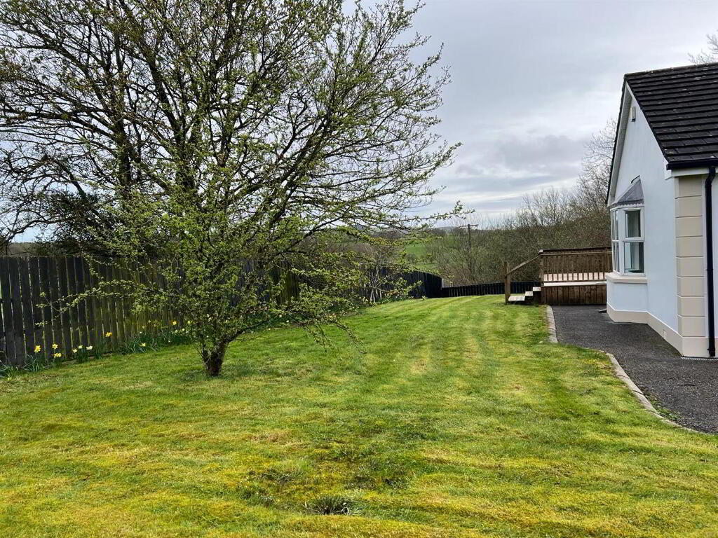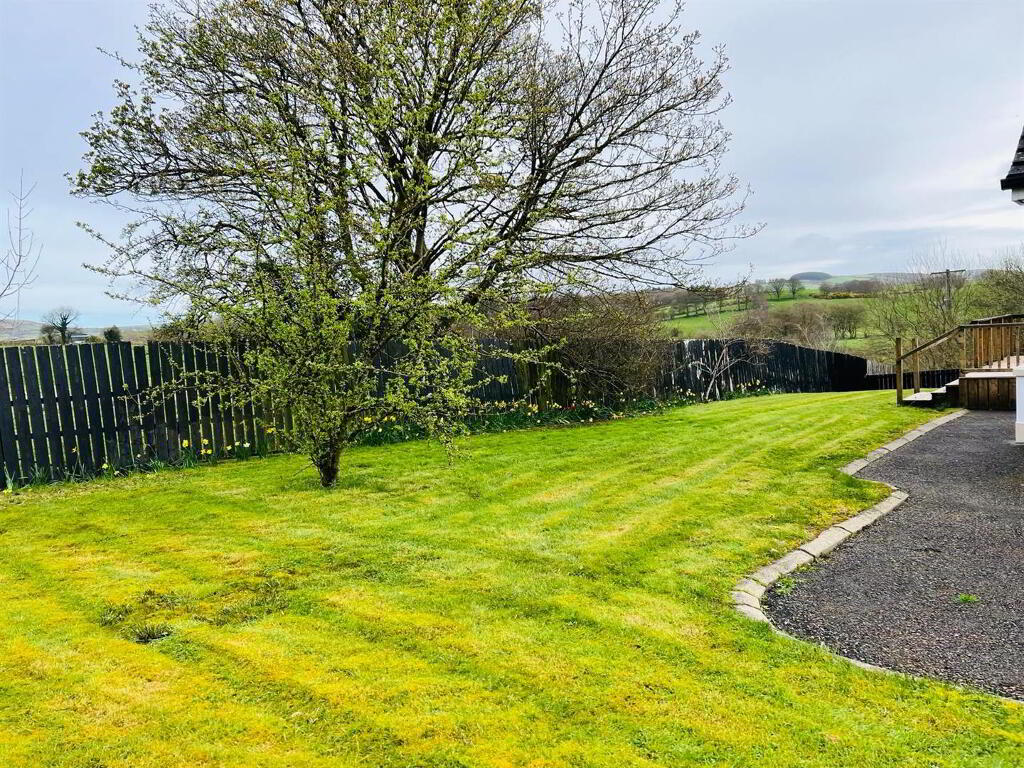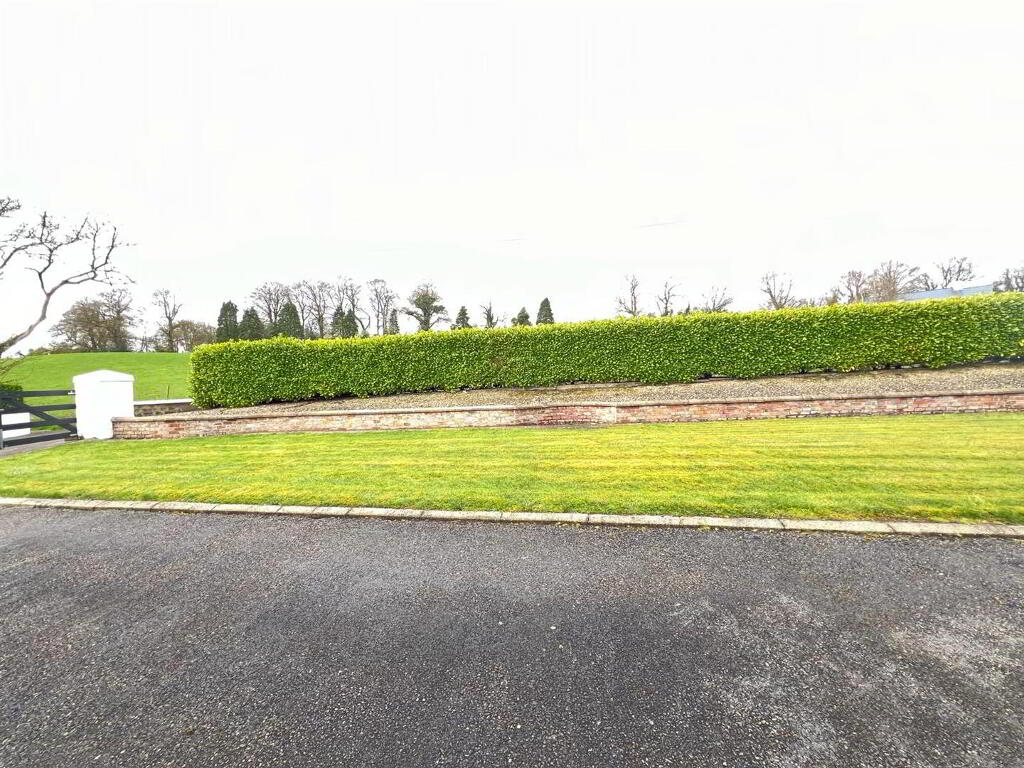 Neat lawn to front. Extensive side lawn bordered by hedging and fence. Decked patio area. Tarmac driveway with pillars and double entrance gates.