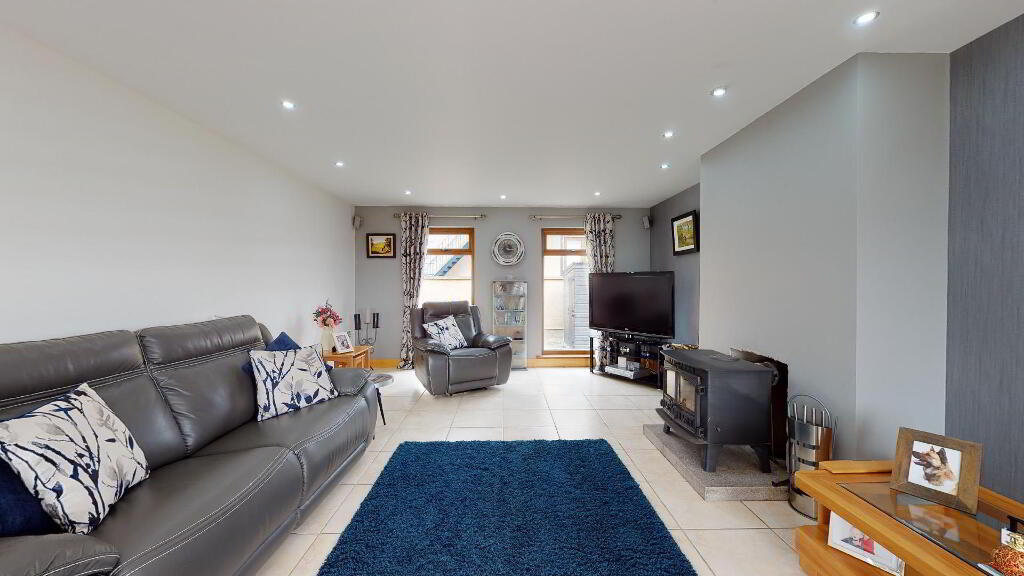 having raised tiled hearth with multi-fuel stove, tiled flooring, recess lighting to ceiling, dimmer switch, sliding patio doors to concrete patio area.