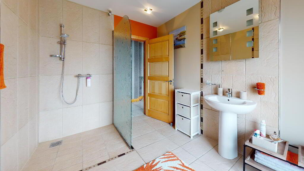having fully tiled shower cubicle with thermostatic shower, fitted Jacuzzi bath, pedestal wash hand basin, low flush w.c., stainless steel room heater, recess lighting, Velux window, part tiled walls, tiled flooring.