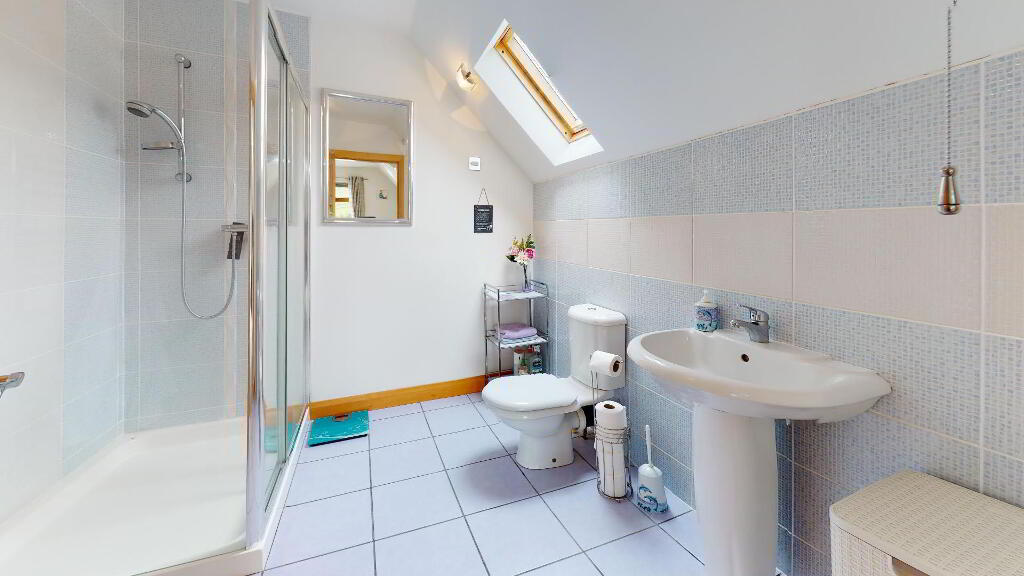 having fully tiled shower cubicle with thermostatic shower, pedestal wash hand basin, low flush w.c., Velux window, part tiled walls, tiled flooring.