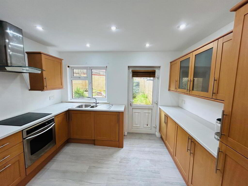 Having eye and low level units, 1 1/2 bowl single drainer stainless steel sink unit with mixer taps, integrated hob and underoven, stainless steel extractor hood, plumbed for washing machine, recessed lighting, laminated wooden floor.