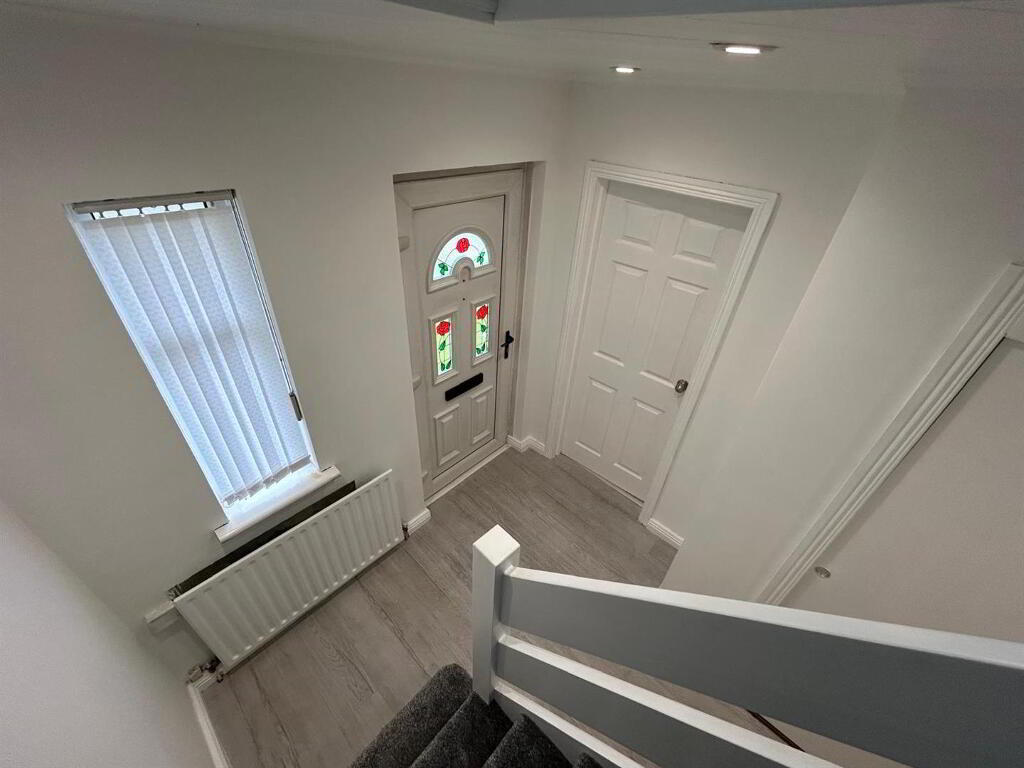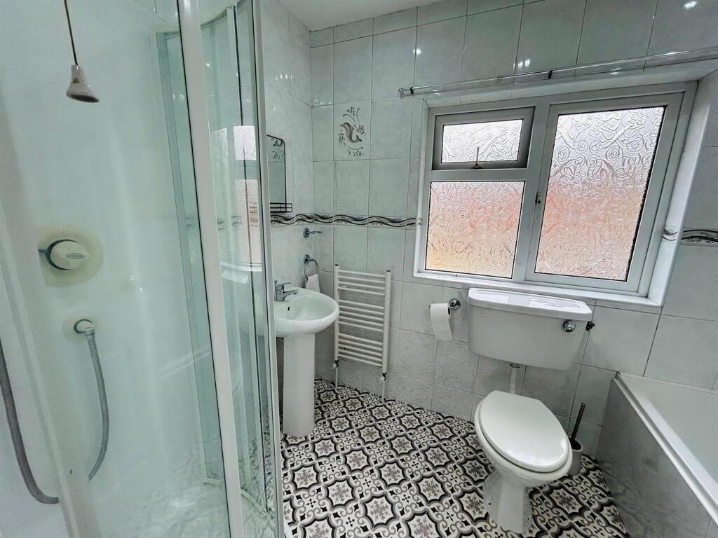 Comprising bath, whb with mixer taps, wc, walk in shower, extractor fan, fully tiled walls, recessed lighting.