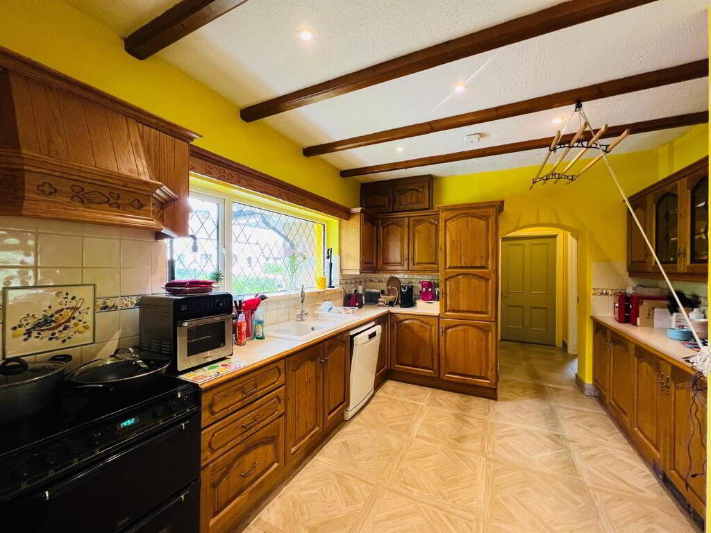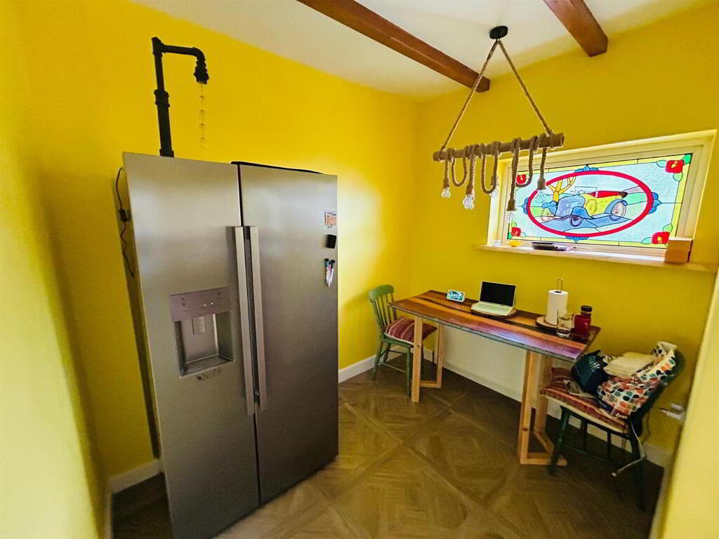 Having range of eye and low level units, tiling between units, wired for cooker, extractor hood, plumbed for dishwasher, dining space, ceiling beams, recessed lighting, tiled floor.