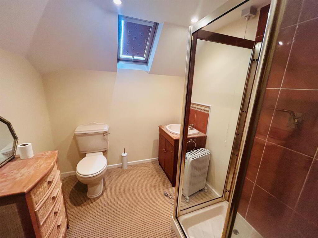 Comprising fully tiled walk in electric shower, whb set in vanity unit, wc.