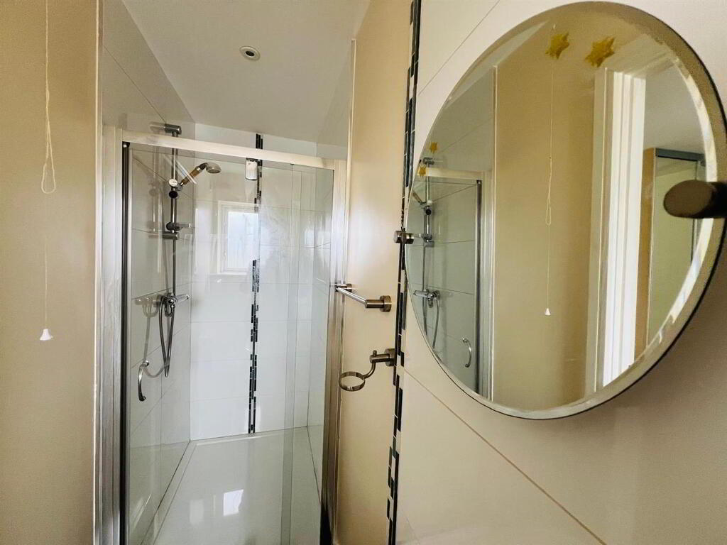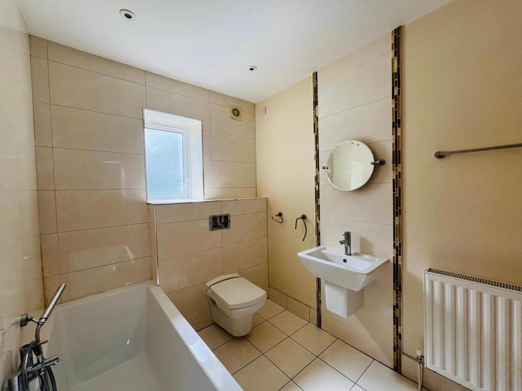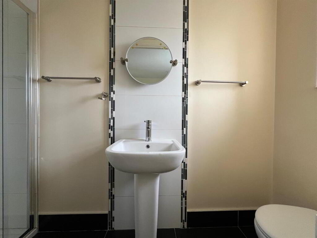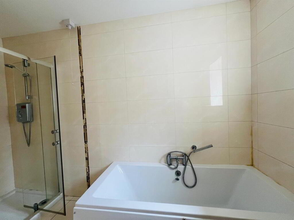 Comprising bath with telephone hand shower attachment to taps, fully tiled walk shower, whb and wc, recessed lighting, fully tiled walls, tiled floor.