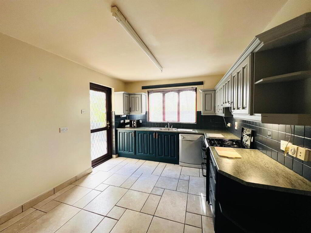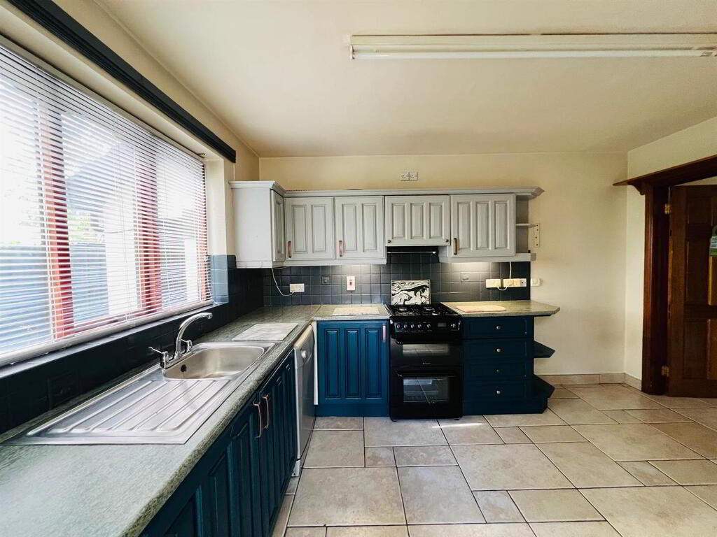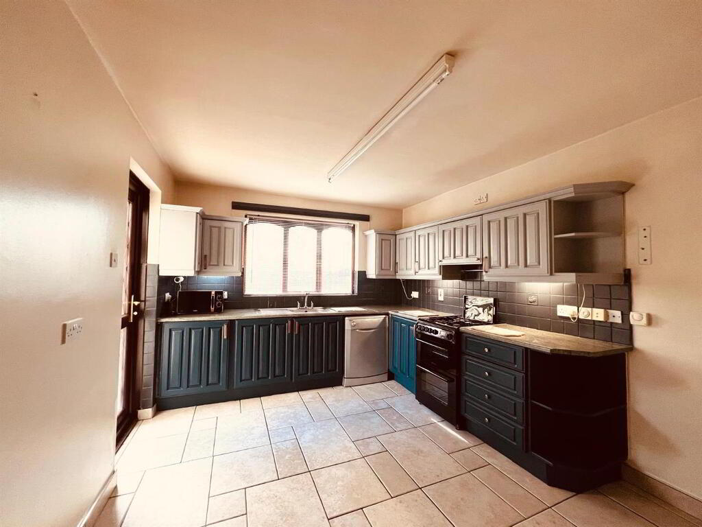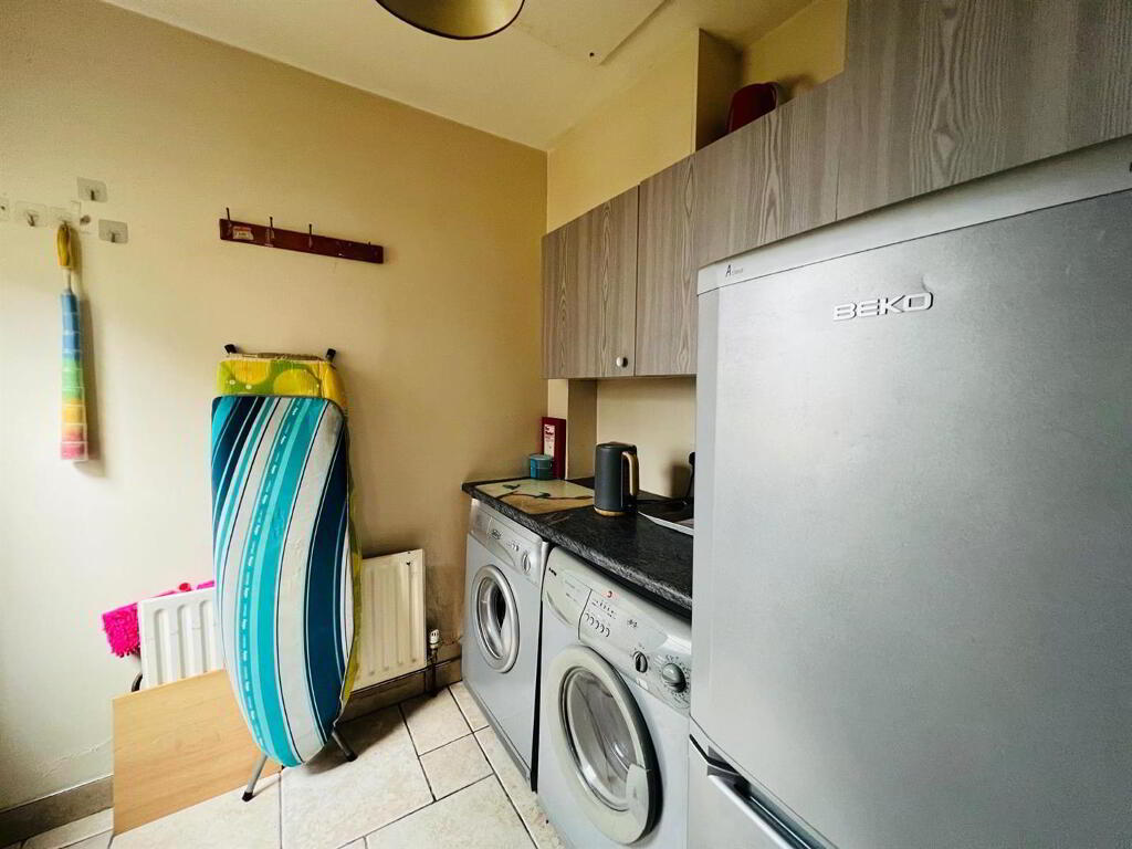 Having eye level units, plumbed for washing machine, space for tumble dryer and fridge / freezer, tiled floor.