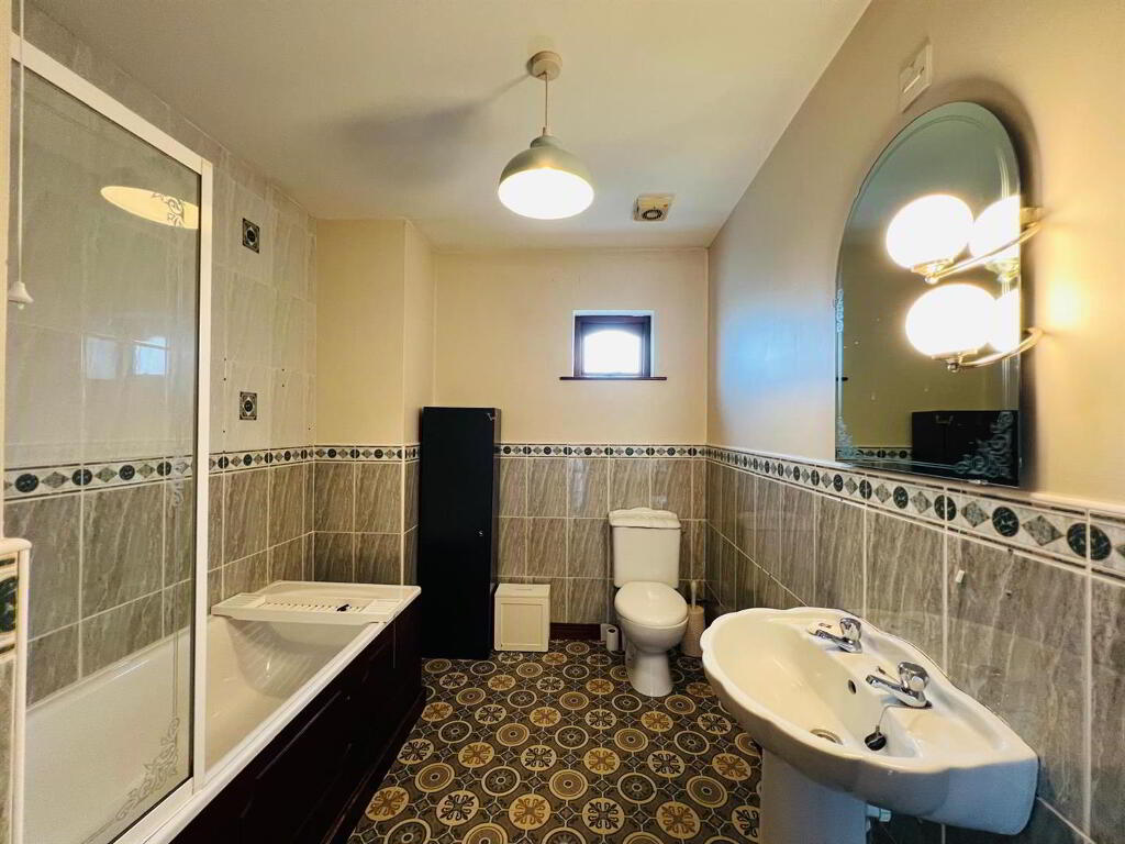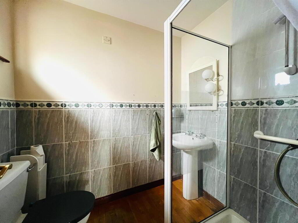 Comprising fully tiled walk in shower, whb and wc, 1/2 tiled walls, wooden floor.