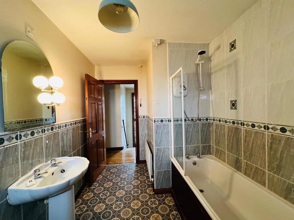Comprising bath with electric shower over, shower screen, whb and wc, 1/2 tiled walls.