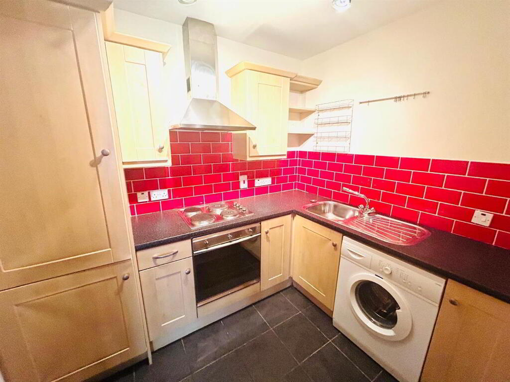Having eye and low level units, tiling between units, single drainer stainless steel sink unit with mixer taps, hob, underoven, stainless steel extractor hood, integrated fridge / freezer, plumbed for washing machine, tiled floor.