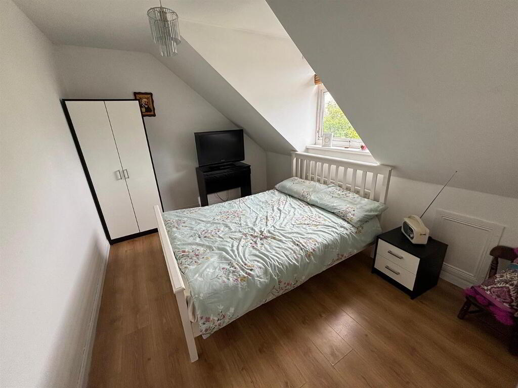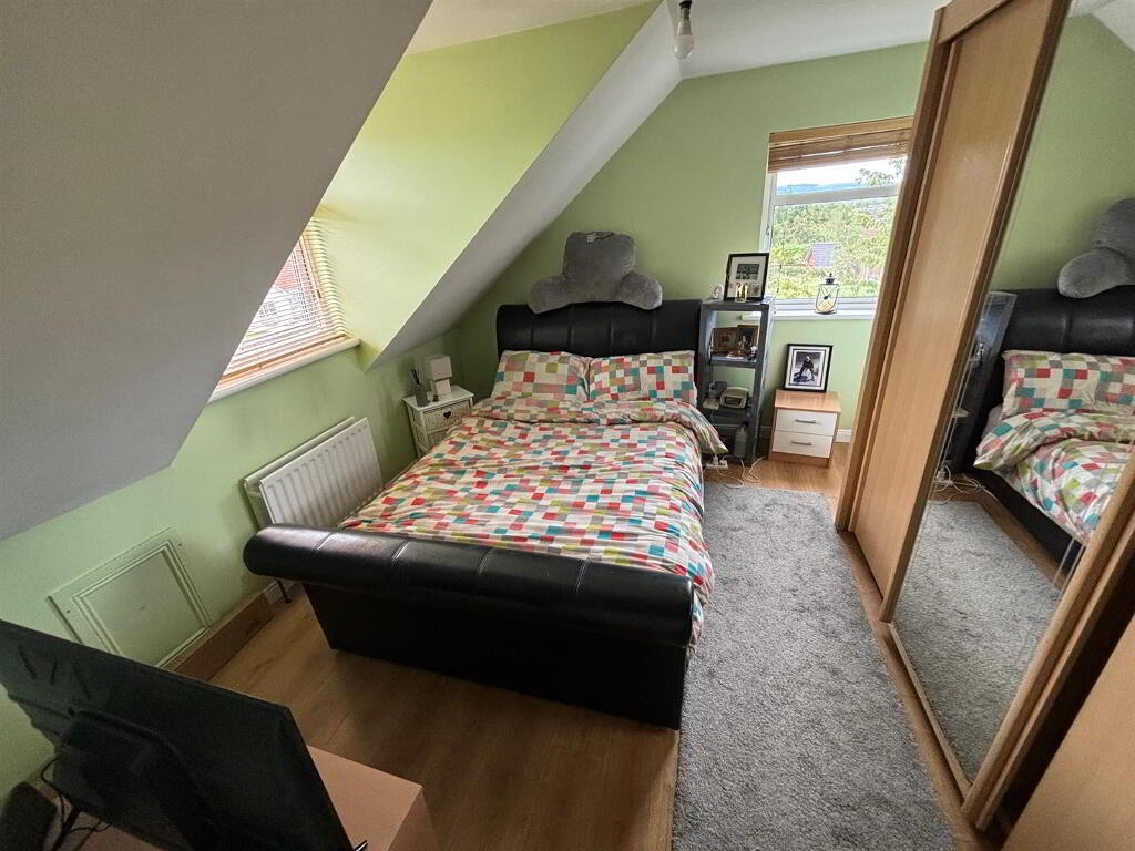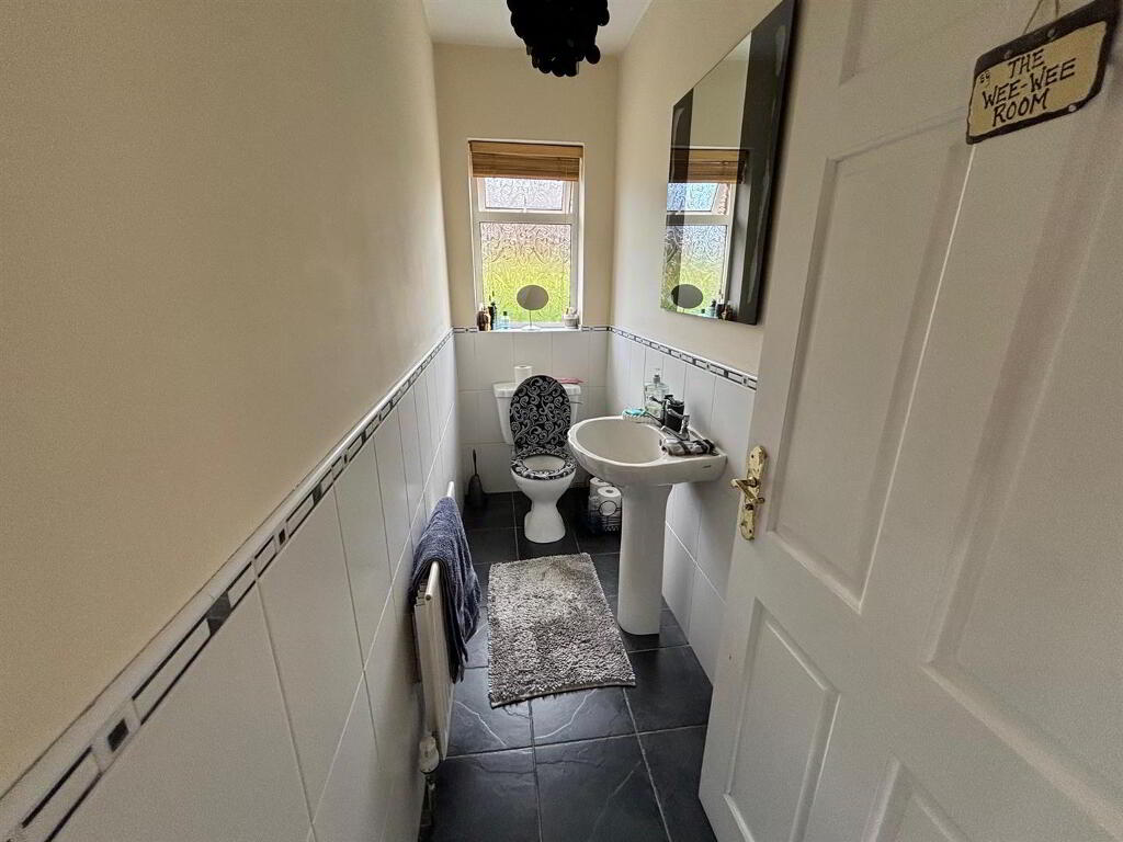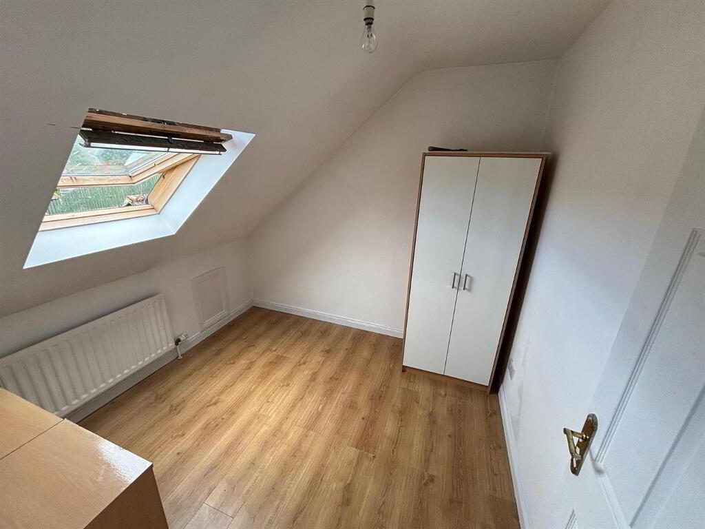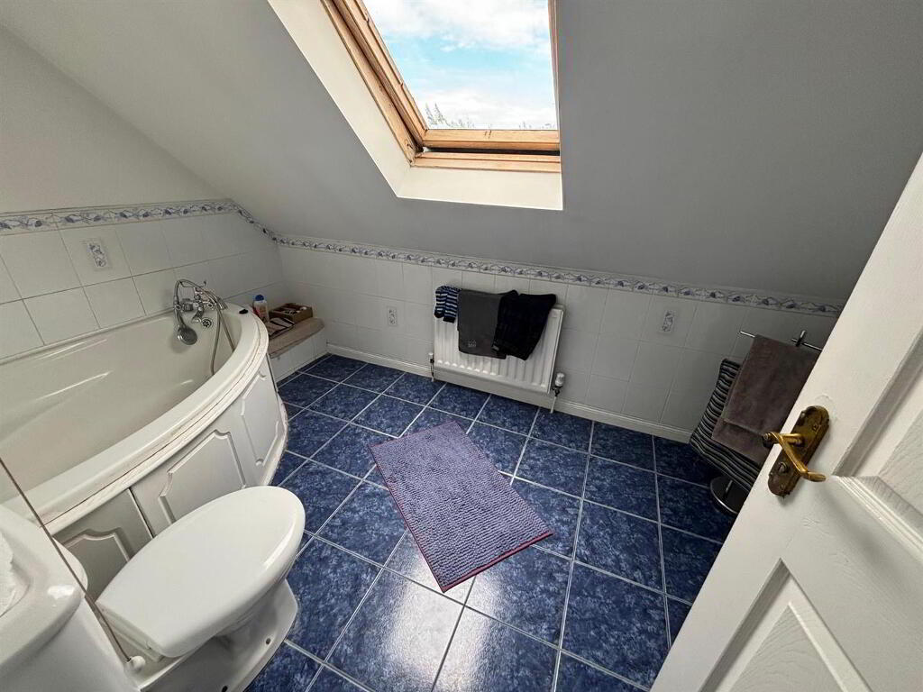 with three piece suite comprising of corner bath with shower attachment, pedestal wash hand basin, low flush w.c. Also having extractor fan, Velux window, part tiled walls, tiled flooring.