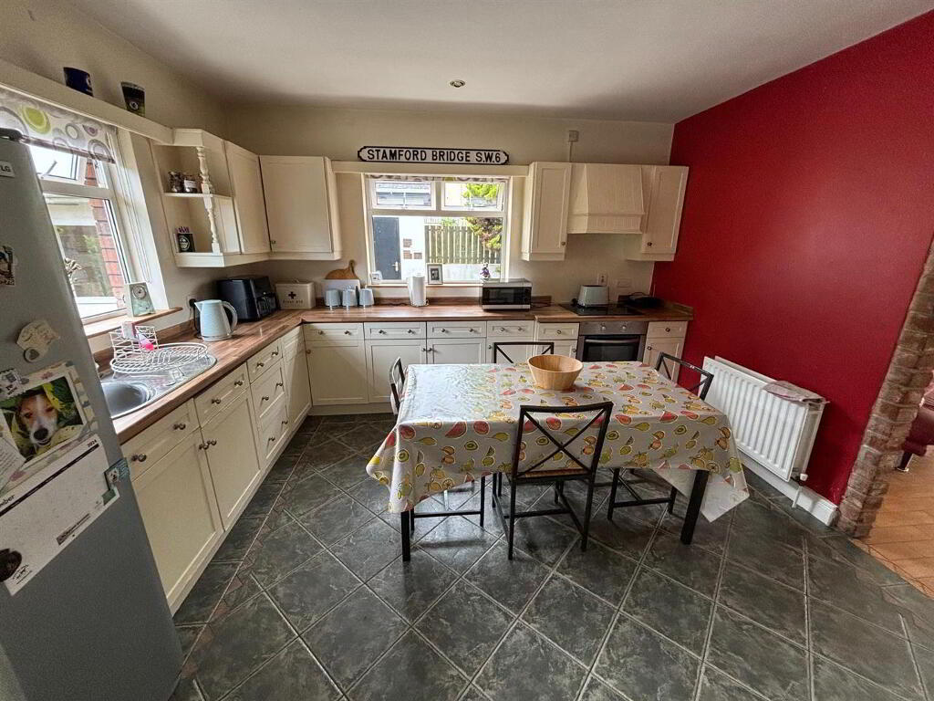 with eye and low level units, matching worktop, under-unit lighting, bowl stainless steel sink unit, built-in hob and oven, extractor fan with light, space for fridge/freezer, corner display unit, recess down-lighters, tiled flooring, feature recess brick arch to family room.