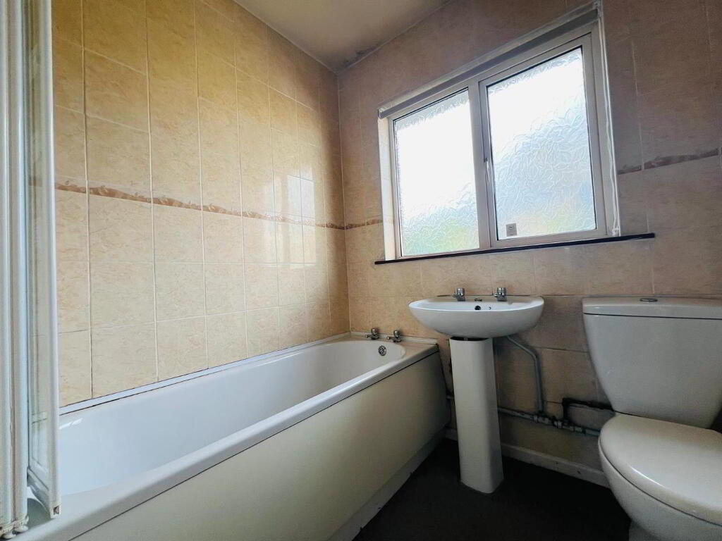 Comprising bath with shower screen, whb and wc, tiled walls.