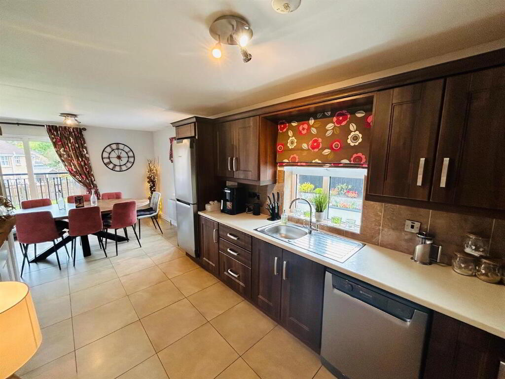Having eye and low level units, tiling between units, single drainer stainless steel sink unit with mixer taps, integrated hob and underoven, space for fridge / freezer, plumbed for dishwasher, patio doors leading to Juliet balcony, tiled floor.