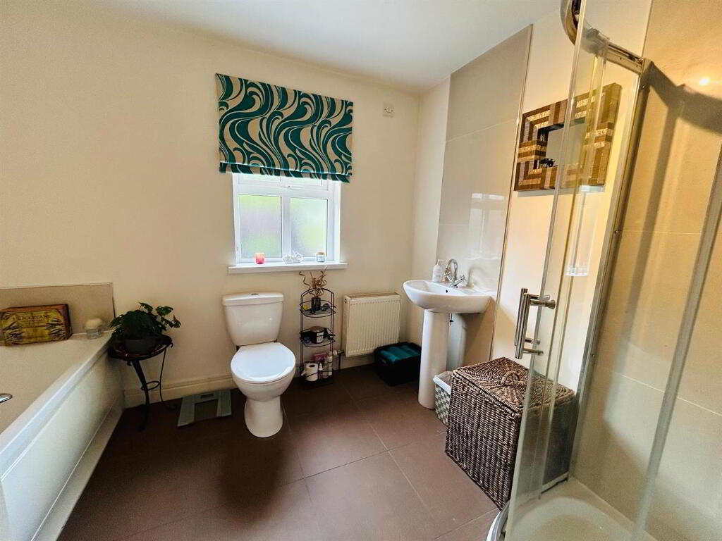 Comprising bath with shower attachment to taps and tiling around, fully tiled walk in electric shower, whb with tiling around, wc, extractor fan, tiled floor.