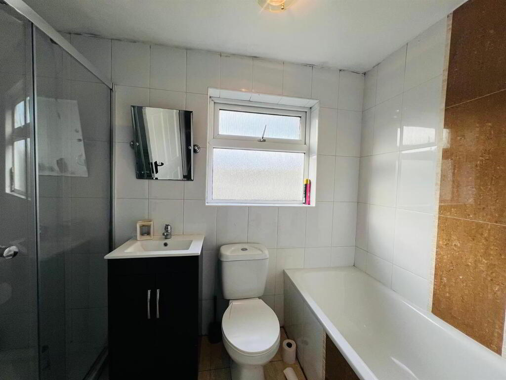 Comprising bath with telephone hand shower attachment to taps, whb set in vanity unit, wc, tiled walk in shower, chrome radiator, tiled floor.