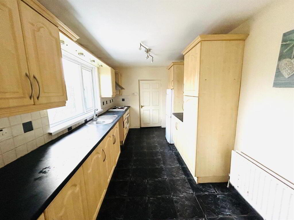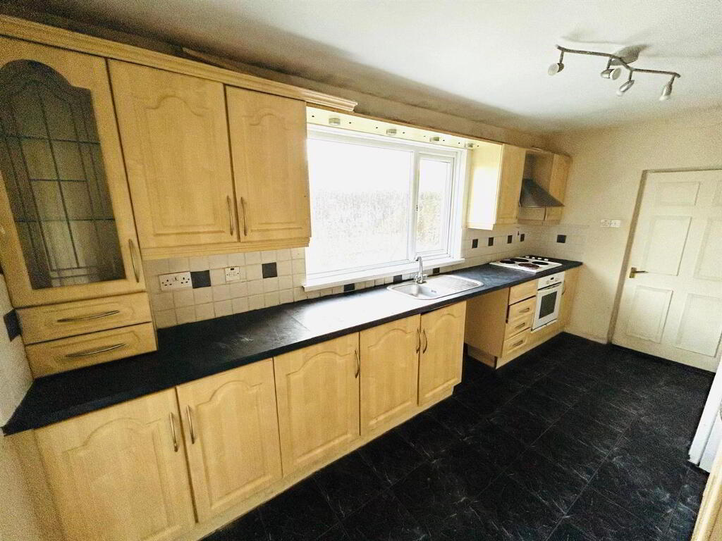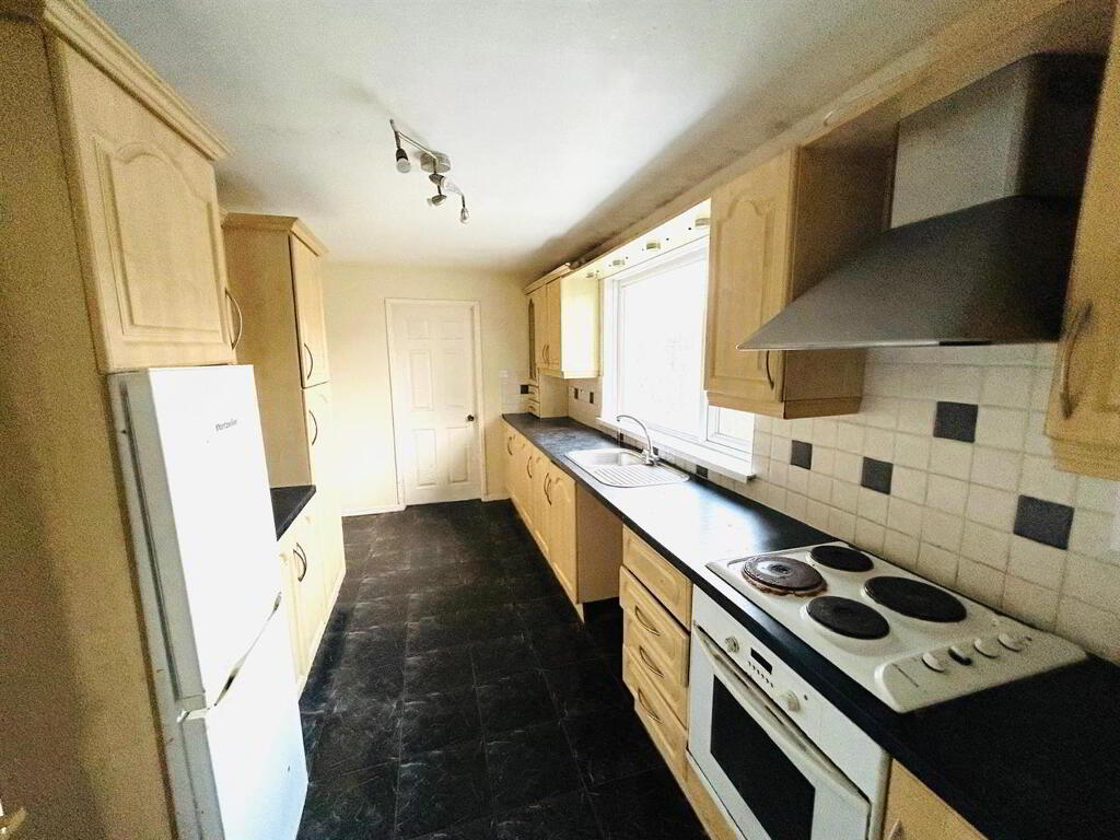 Having eye and low level units, tiling between units, integrated hob and underoven, stainless steel extractor hood, space for fridge / freezer, plumbed for washing machine, tiled floor.