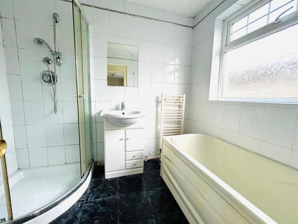 Comprising bath, fully tiled walk in shower, whb set in vanity unit, wc, fully tiled walls and floor.