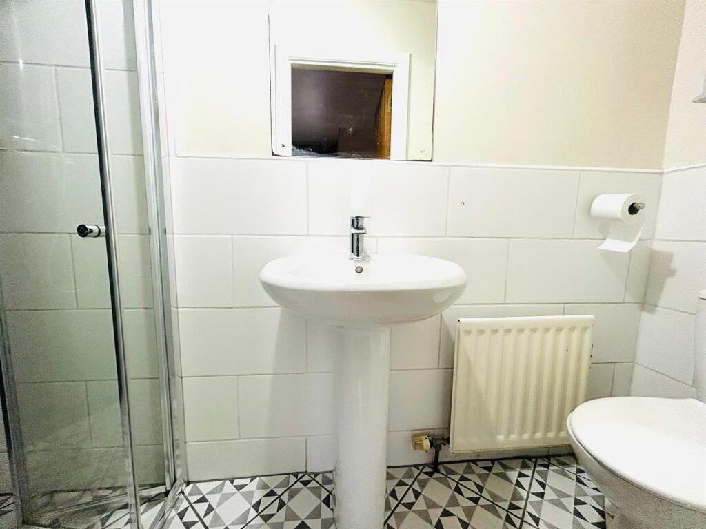 Comprising fully tiled walk in shower, whb and wc, 1/2 tiled walls, tiled floor.