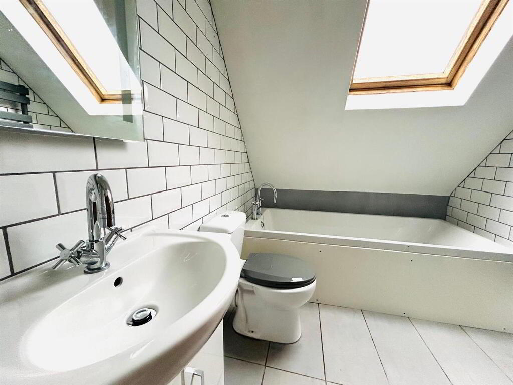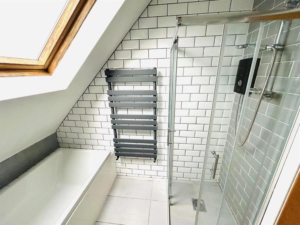 Comprising bath, walk in electric shower, whb set in vanity unit, wc, tiled walls and floor.