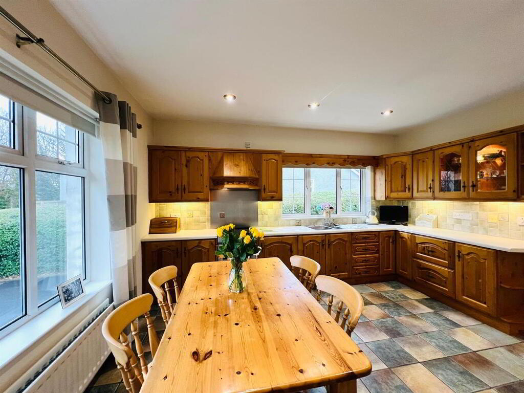 Having excellent range of eye and low level units, glazed display cupboards, tiling between units, 1 1/2 bowl stainless steel sink unit with mixer taps, wired for cooker, extractor hood, ample dining space, tiled floor.
