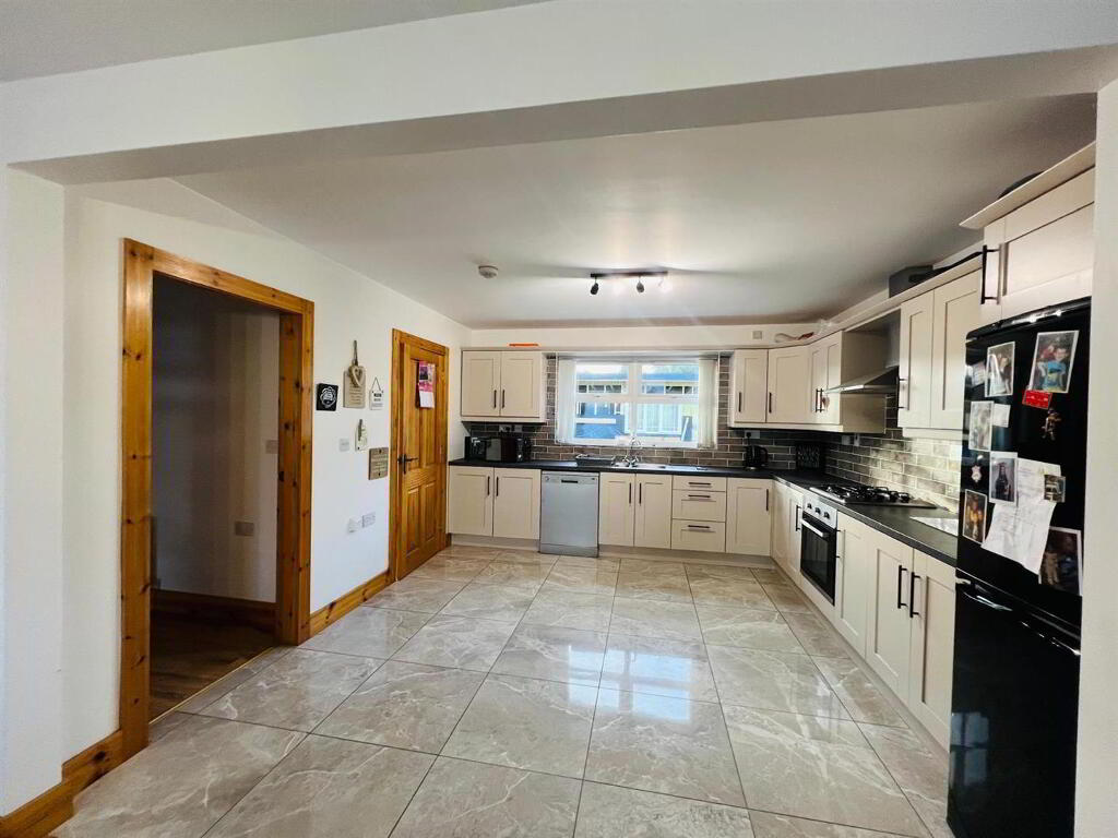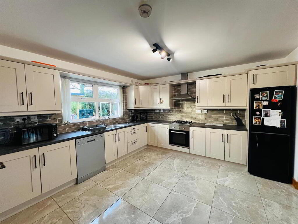 Having range of eye and low level units, tiling between units, 1 1/2 bowl stainless steel sink unit with mixer taps, gas hob, electric underoven, stainless steel extractor hood, plumbed for dishwasher, space for fridge / freezer, tiled floor, open plan to Dining.