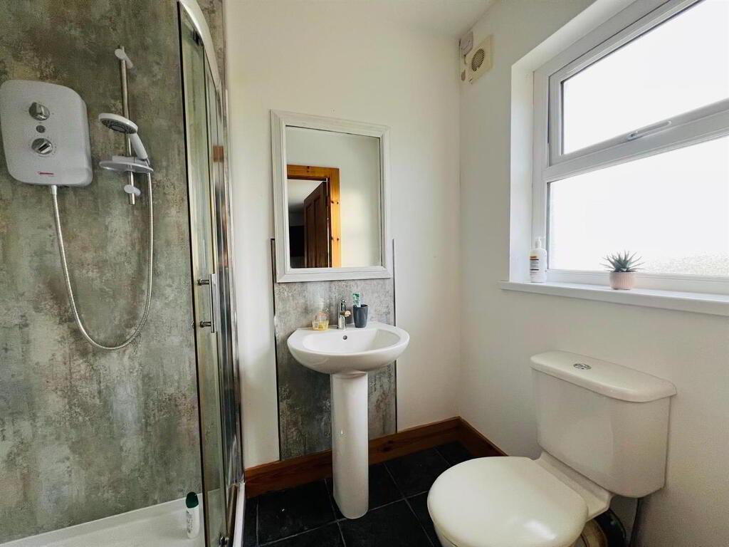 Comprising walk in shower with PVC cladding to walls, whb and wc.