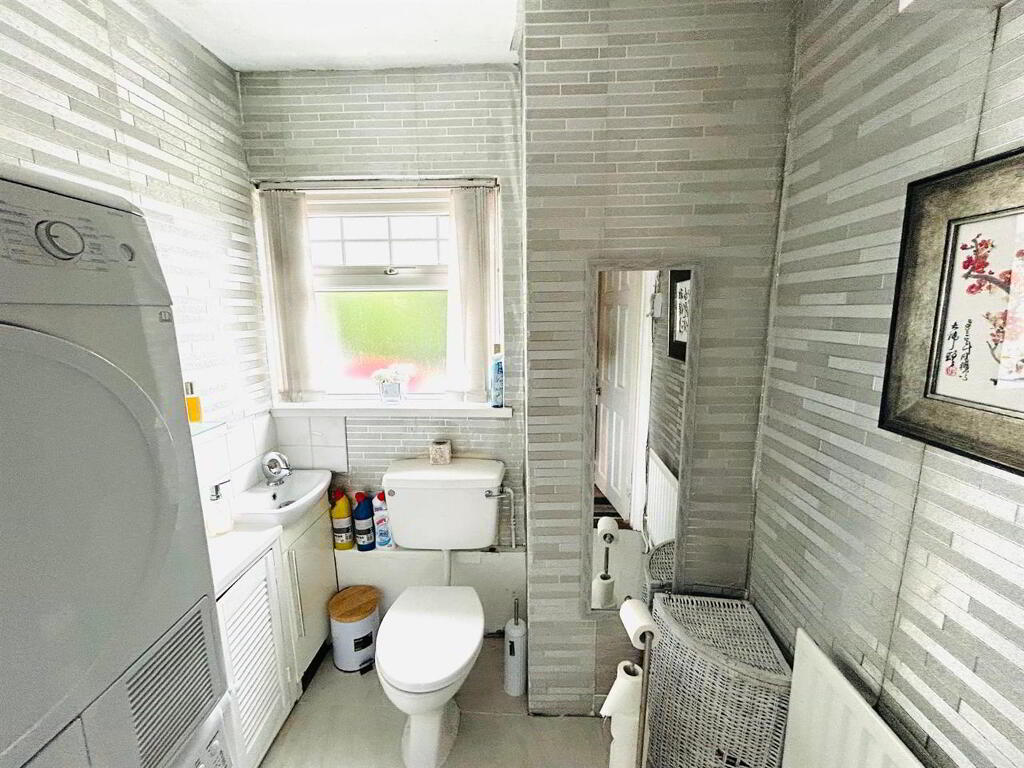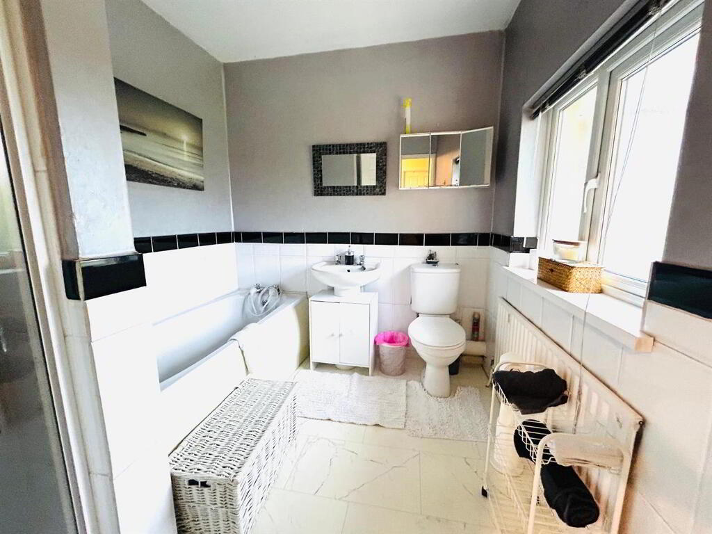Comprising bath, whb and wc, walk in shower, 1/2 tiled walls, tiled floor.