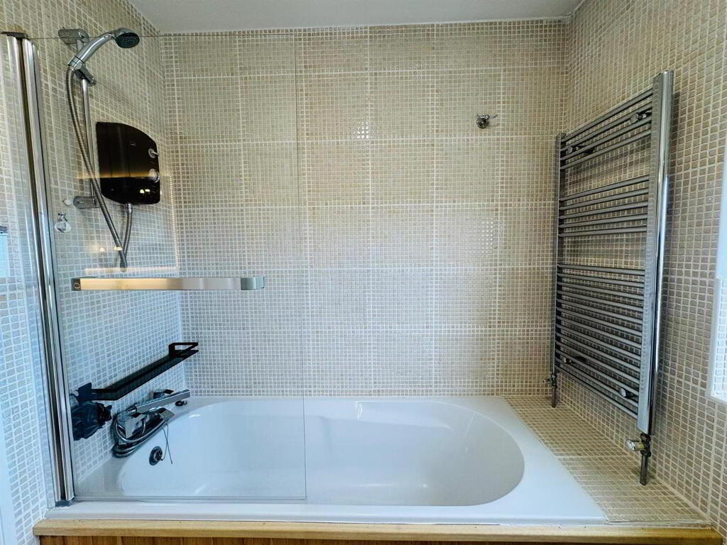 Comprising bath with electric shower over and tiling around, shower screen, WHB set in vanity unit, WC, 1/2 tiled walls.