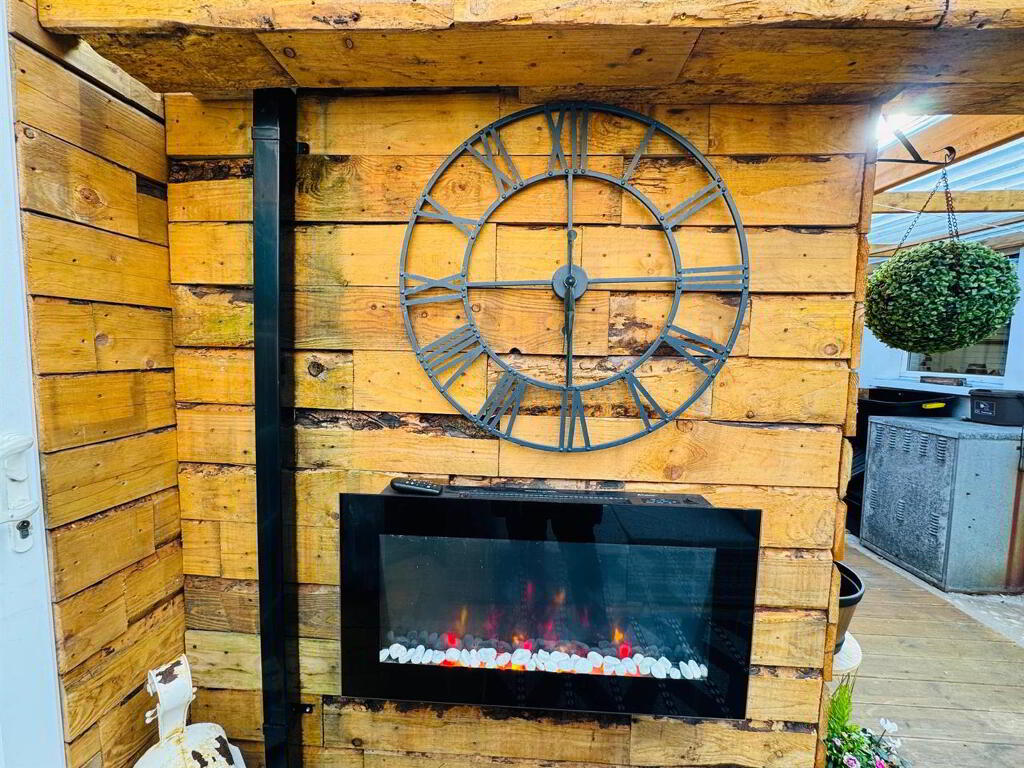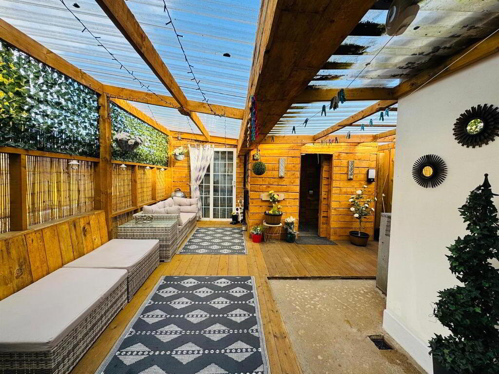 Covered patio to rear with decking with Cabin/Summer House. Tarmac driveway with extended gravel parking. Bin enclosure. Storage shed. Exterior sensor lighting. Outside tap.
