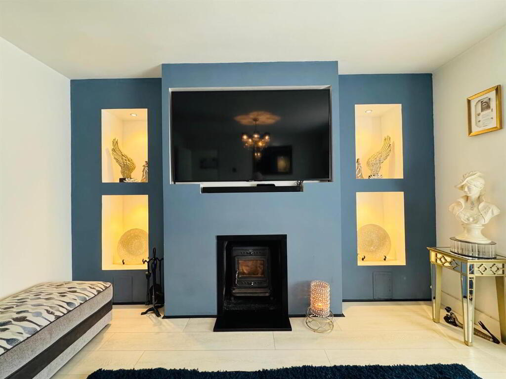 Having feature media wall with multi fuel stove, laminated wooden floor.